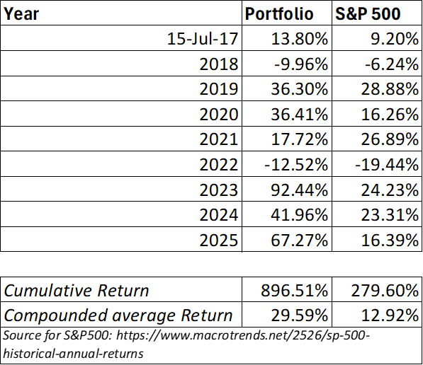 This past year has been a satisfactory one for our capital. Since we began this journey in mid-2017, our compounded annual gain has outpaced the broader market, thanks largely to a decision I made some time ago: to stop fretfully diversifying and instead put our eggs in a few baskets we really like—and then watch those baskets very closely. In 2025, AfterValue delivered a gain of 67.27%. While a “fat” year like this is always a pleasant surprise, one year’s weather doesn’t tell you much about the climate. The figure that truly matters is a long-term record. Since I began in mid-2017, the capital has grown at a compounded annual rate of 29.59%. In this business, a single year’s jump can often be attributed to the “tailwinds” of the market; however, compounding at nearly 30% over several years suggests that the philosophy of buying great businesses and holding them tight is serving well. If I have one regret regarding our performance over the last three or four years, it is that I didn’t spend more time doing absolutely nothing. Had I simply held onto our best ideas for longer periods, our returns, which are already quite good, would have been truly eye-popping.